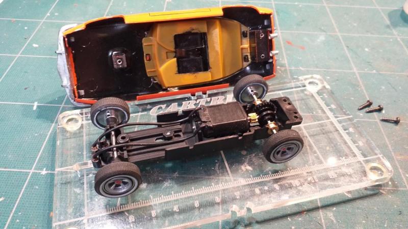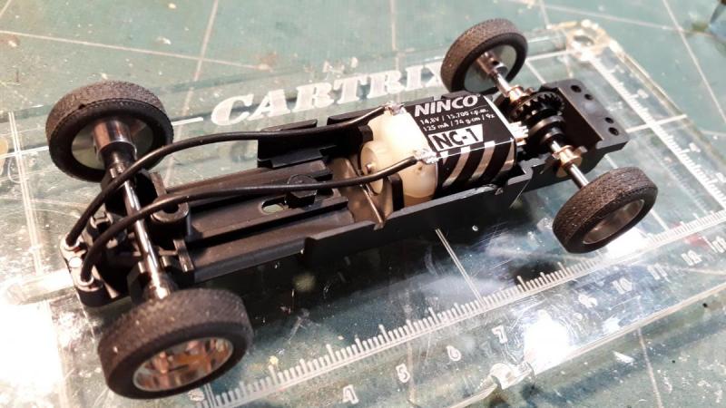 Après avoir déniché le kit, plutôt facile à trouver et à prix abordable, il faudra ajouter un châssis Slot Classic (toujours lui...), un moteur type Ninco NC1, 2 essieux Slot It 2.38, une couronne, pignon, paliers, support de guide type Ninco 80106 ( remplaçable par des SRC SP 10080 ou Scaleauto SC 1621 selon dispo ) et un jeu de jantes alu BRM ou autre...