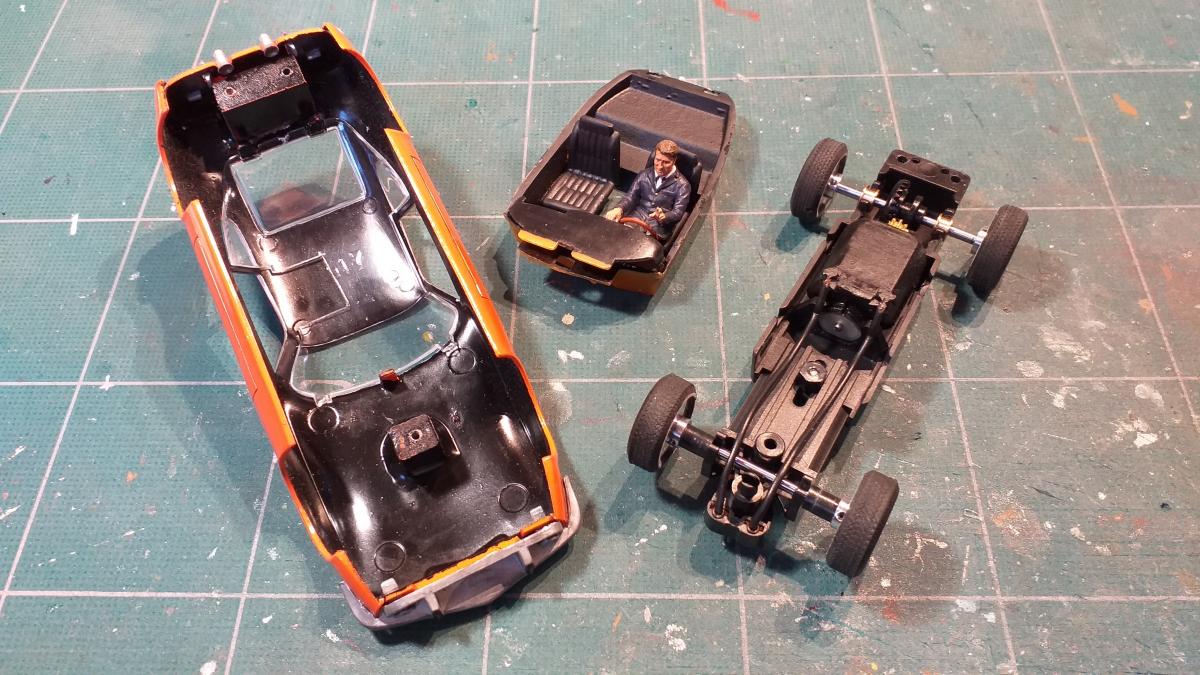 Après l'apprêt mis avant ( j'adore ! ) j'applique une teinte orange en bombe de chez Tamiya TS12, et du noir satiné au pinceau sur les parties intérieures de la caisse et du châssis;