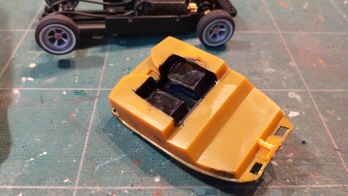 Ensuite il faudra préparer l'intérieur pour le passage du moteur; découpe du fond de l'habitacle et des fauteuils.