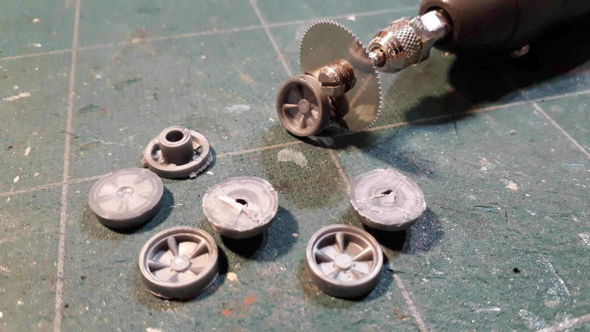 Les jantes du kit ont été découpées dans leur épaisseur, poncées et ajustées de façon à rentrer dans les jantes alu; là encore, attention aux doigts si vous voulez continuer à monter des kits !