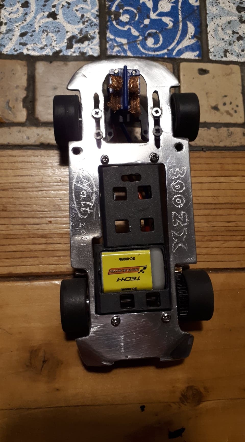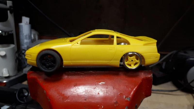 Salut a tous , j était pas trop la ces derniers temps. Pour ceux qui ont suivi , ma mustang finie , j ai attaqué une nissan , base snaptite pour quelqu un qui aime bien mes autos . Ca s est fait par hasard , je lui ai acheté une capri zakspeed sideways sur le bon coin , et il m a reconnu ,! et m a demandé si je pouvait lui motoriser une maquette qu il possède depuis un bail et qu il n a jamais osé convertir ... Une 300 zx j ai dit banco ! une de mes autos favorite depuis enfant , en plus il la veut rouge et d origine , comme j aime ! Apres la mise en garde d être un débutant , il était toujours chaud et m envoyé la bestiole . J ai pu modifié les jantes de la maquette pour en faire des inserts , j en suis tres content , le gros défi va être de fabriquer des feux arrières .... fatalement il aimerait des feux qui s allument , et dans la maquette , les feux arrières ainsi que le T top sont des autocollants ... tristesse.... Le T top easy , j ai déjà réglé le problème , le feux , je retarde l echeance .... Alors elle est bien avancée , et roule bien , je vous met des photos depuis le début de l aventure . Comme d hab dans mes autos , mon traditionnel châssis alu , poli cette fois , c est pas pour moi alors je m applique et essai de faire un truc joli et bien fini , en tout cas du mieux avec mes moyens , outillage et compétences . J aime beaucoup cette auto , je pense qu elle sera jolie et marrante a rouler , ça va être dur de la laisser partir ! voila place aux photos du début jusqu a ce soir ; Merci de m a voir lu !