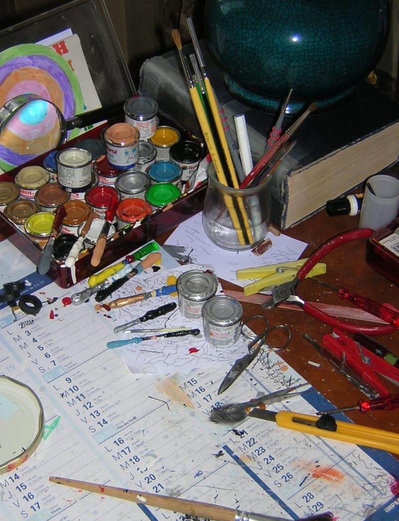 Mon petit atelier 0.5 x 1m devant la fenêtre. Je peins qu’à la lumière naturelle, plein sud.