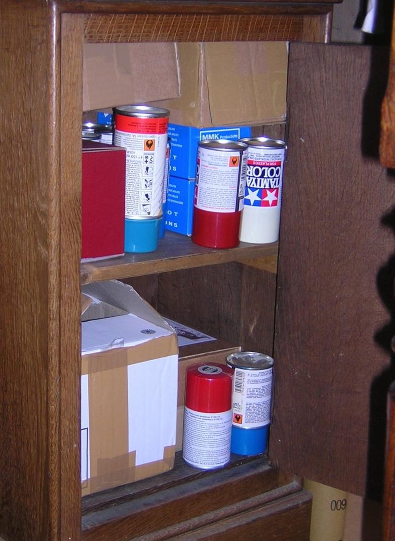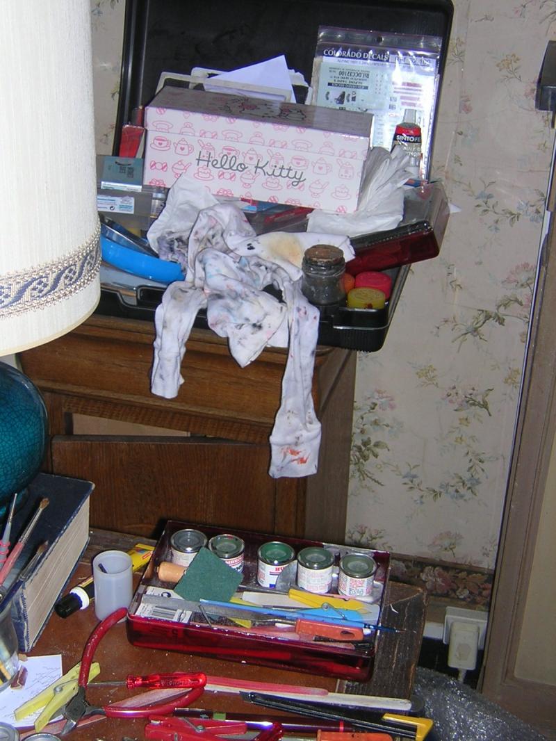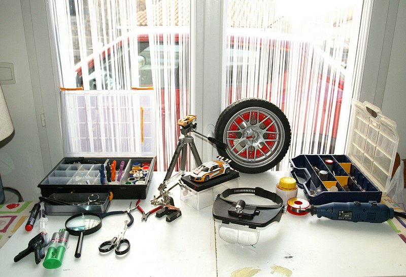 Tout un tas de peintures de toutes les couleurs (on peut faire des mélanges, c'est quasi infini), un dremel, petites fraises, ciseaux à lexan, une petite boite avec tout plein de petits trucs de récup (chutes de photodécoupes, strass pour les phares, épingles à têtes rondes pour les leviers de vitesse, etc....)