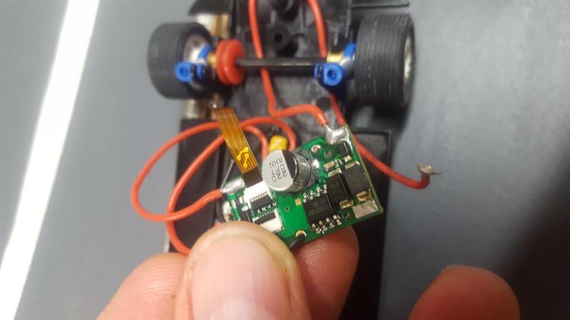 Quand je pose la voiture sur la piste la puce chauffe et fait sauter une des soudures des fils de guide ! Dingue.
