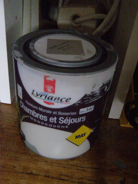 2 peintures mat à l'eau (très important j'expliquerais plus loin), clair et foncé. La première peinture est une couleur 'Terre d'argile' de la marque Lyriance achetée dans la grande surface E. Leclerc...
