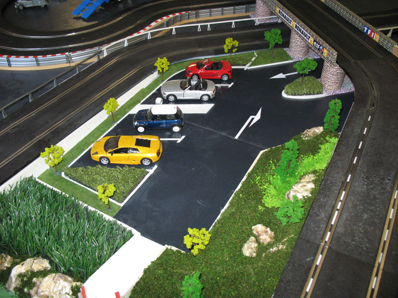 Salut! moi, j'ai essayé la peinture en bombe, alors galère, car même avec du tirot de masquage, ça bave et après, si ça te plait pas, bonjour pour retirer. J'ai fait mon parking comme ça, et puis pour les flèches, j'ai essayé autre chose et c'est impec: découpe dans feuille de papier normal A4 avec colle std. (voir les flèches) et si ça te plait pas, tu décolles facilement et pas de trace