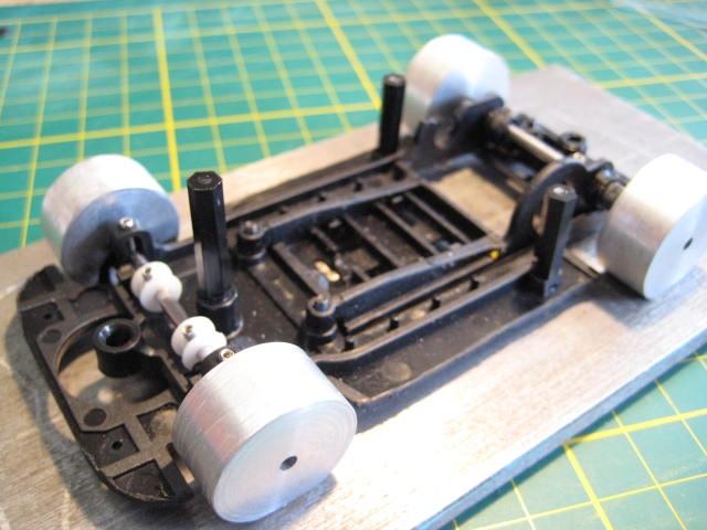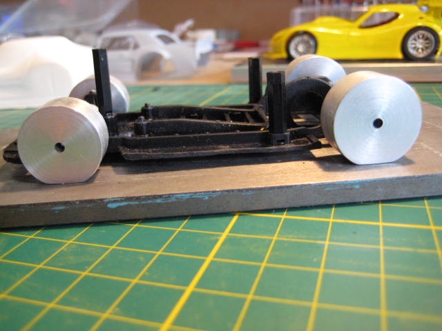 pour la symétrie , j'ai un truc , j'ai tourné 4 pièces dans de l'alu , que j'ai fraisé pour avoir un plat ( j'ai même ajouté un petit aimant à chaque pour qu'il restent bien en place sur la plaque ) . la hauteur de chacune de ces pièces correspont à la jante , le pneu, et l'espace que je désire avoir entre ma roue et la carro .