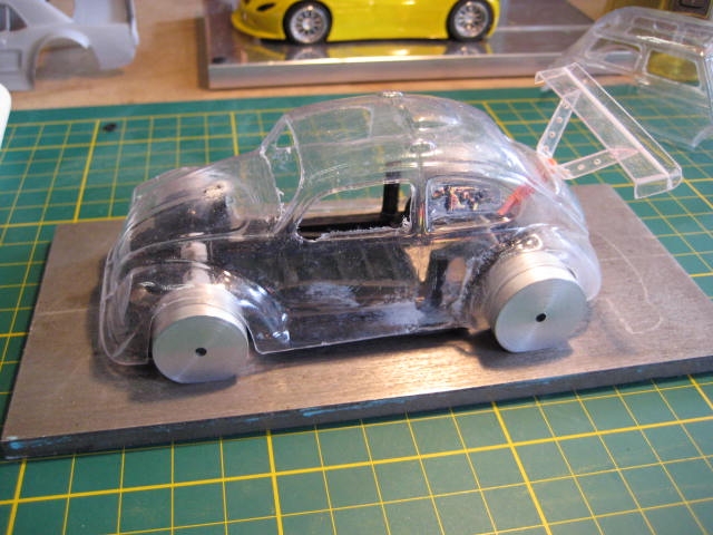 quand c'est bon , je place mes puits de vis au endroits que j'ai prévus , un point de colle sur chaque puits de vis et il n'y a plus qu'à déposer la carro qui tombe pil poil . laisser sècher et le tour est joué . je mets les photos , mais ce sont celle du gabarit de mes vw fun cup . le principe reste le même .