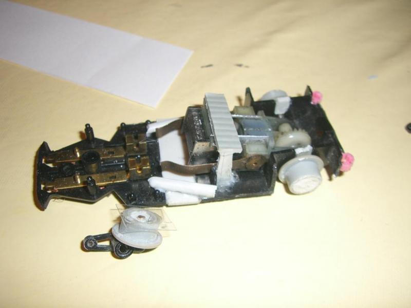 Chassis jouef avec une minialuxe trouvée sans chassis sur ebay, il manque un parechoc, je vais le récupérer sur l' estafette Renault. J' ai mis un peu de fibre de verre dans la caisse pour aténuer l' effet banane.