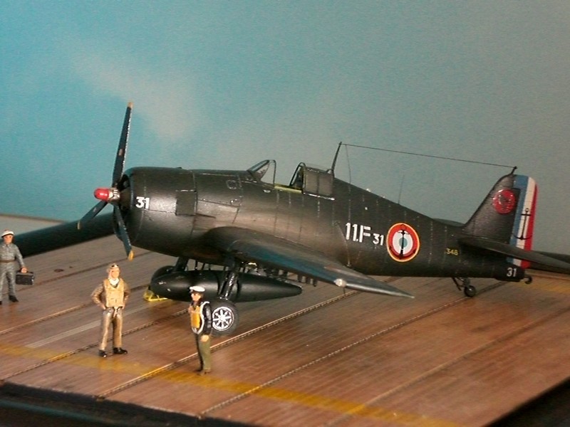 Pour commencer,voici un F6F5 HELLCAT de la Flotille 11 F (brin d'arrêt et hippocampe) sur le pont d'envol du porte-avions ARROMANCHES à l'automne 1953 (campagne d'Indochine).