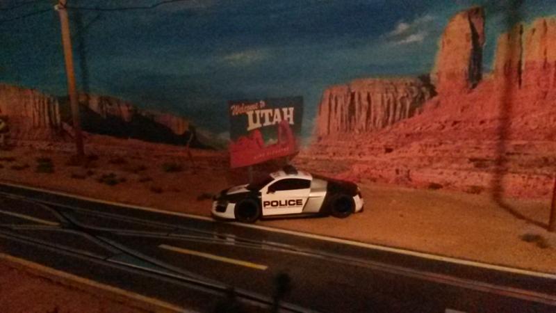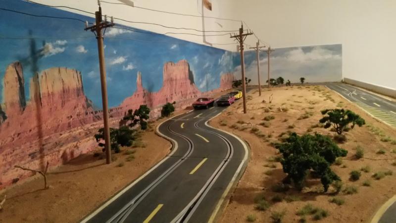 bonjour, voici quelques photos de mon circuit. tout a été réalisé par mes soins hormis le fond du décor qui est un stickers de 5m de long sur lequel j'ai tous de même repeint le ciel à mon gout.