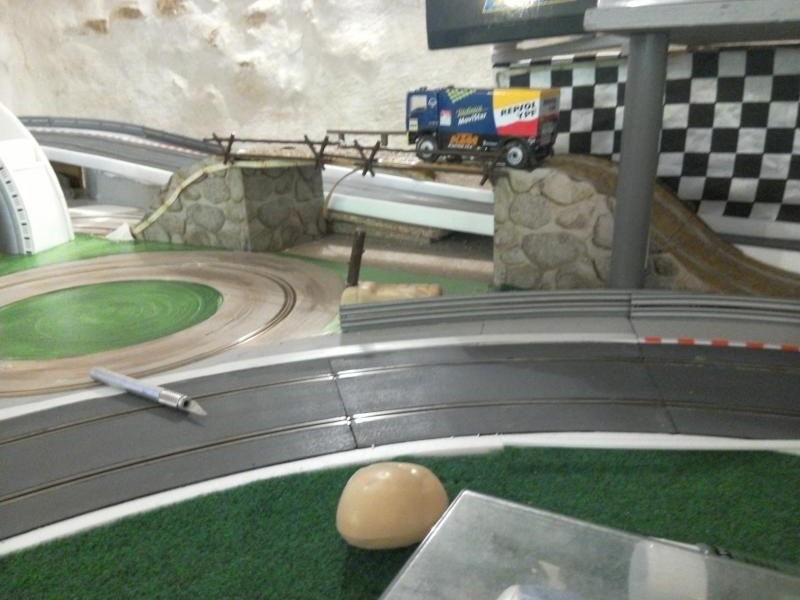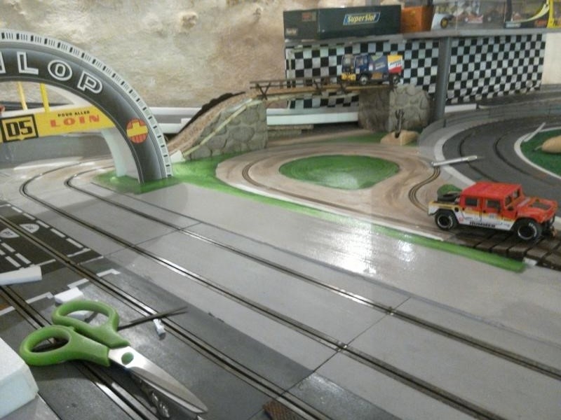 La boucle raid est à base de scalex sport, classic, scx off road(pour le gros pont) et de polistil/ tonka 1/43 de récup. le polistil m'a servi pour confectionner les boucles, récup du pont souple en" bois" et truc complètement inutile, donc indispensable: des poire en plastic souple qui, quand on appuie dessus font tomber un tronc sur la piste(cf photo