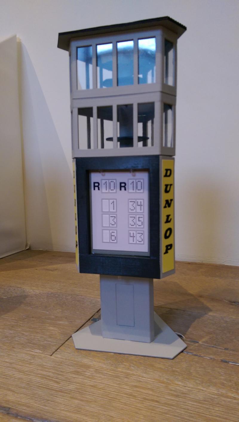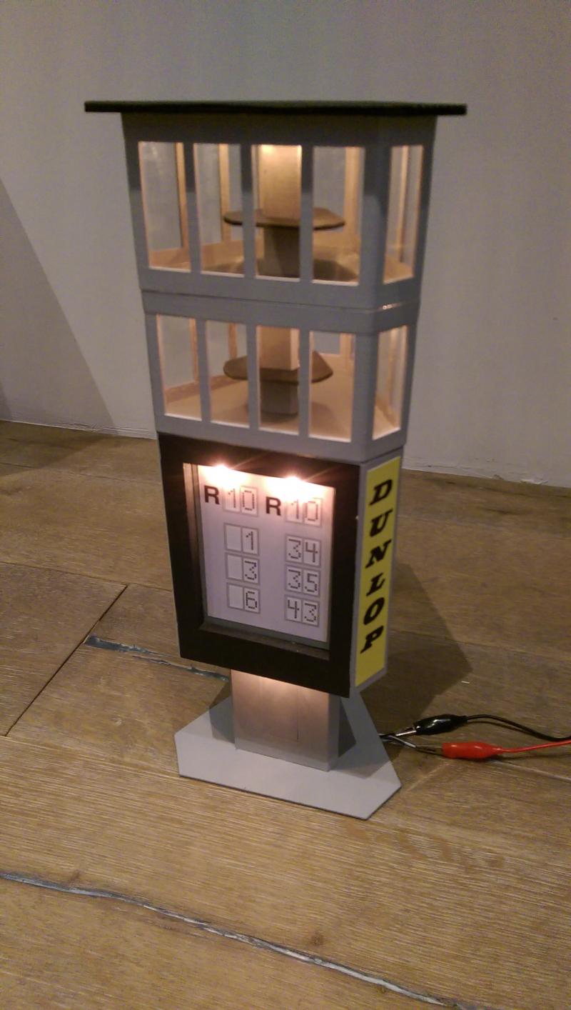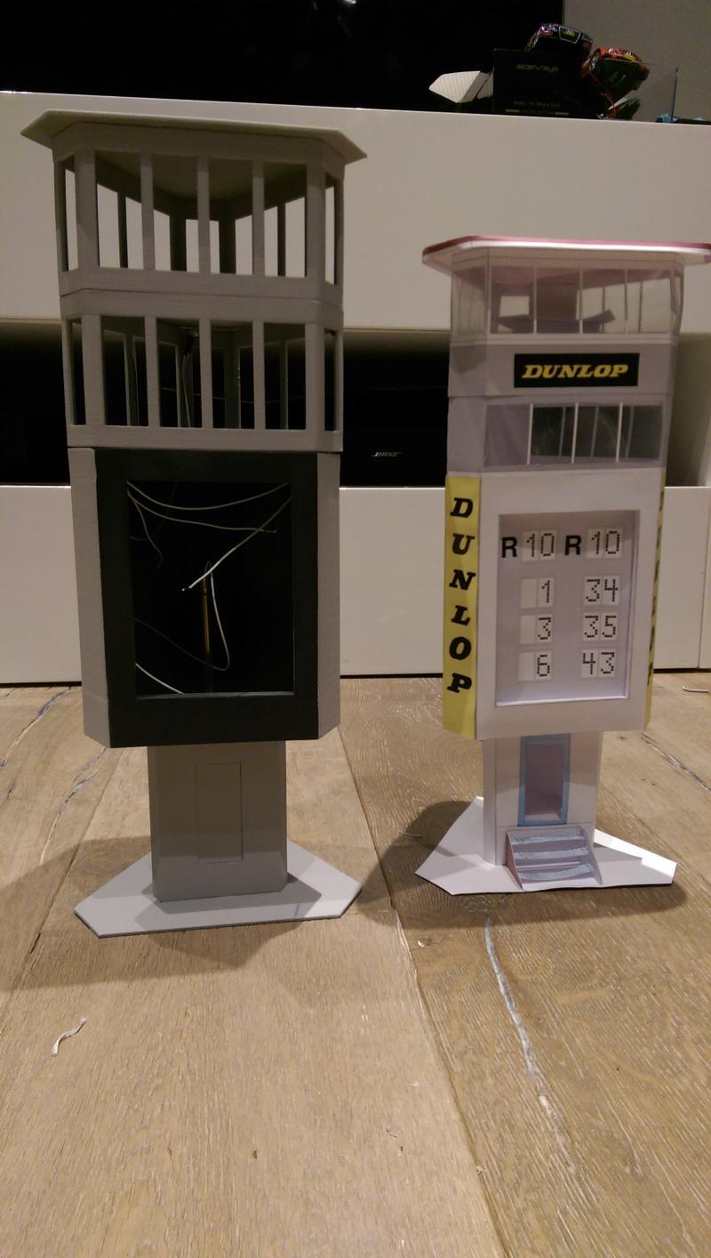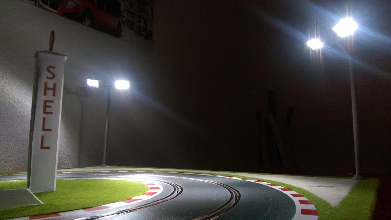 Voici une petite photo de la tour Dunlop éclairée, faudra que je mette un cache devant les deux lumières sur le chrono, ou alors je déplace la lumière au-dessus des dunlop en imprimant un cache qui recouvrera l'ampoule !