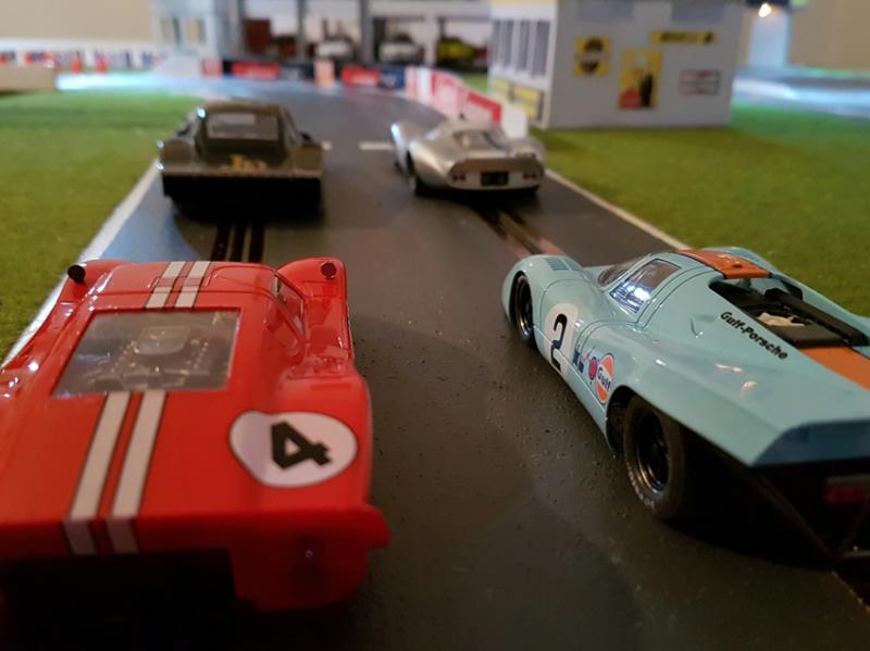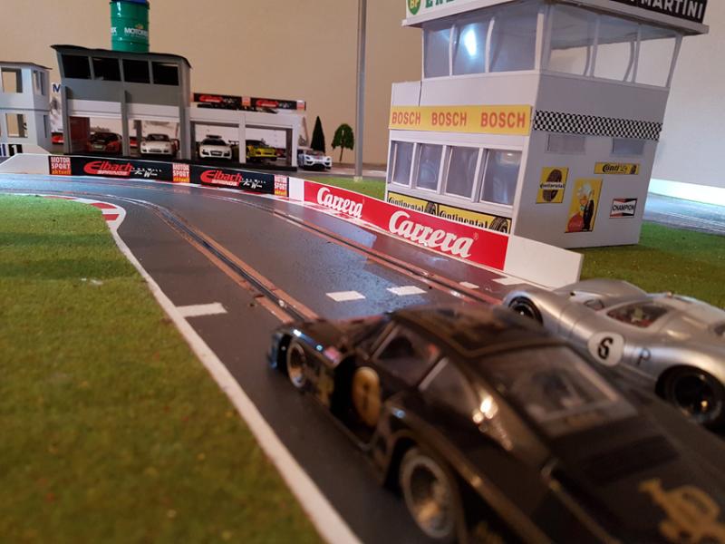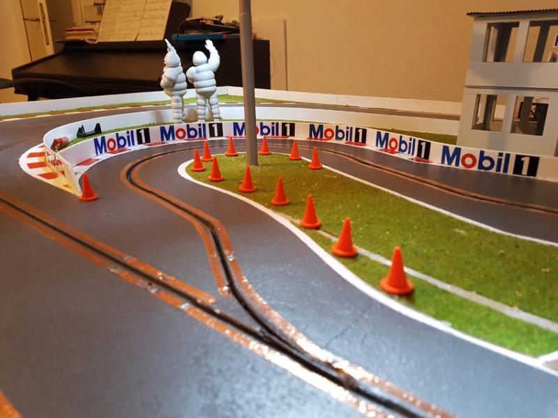 Ce week-end petit update... J'ai remplacé des glissières SCX par des murets coupés dans une plaque de mousse/pvc déjà tintée en blanc. C'est la classe mondiale. Ca se colle au pistolet à colle et c'est franchement beau... gain de temps considérable par rapport aux bandes de mdf à couper, à peindre et à coller.