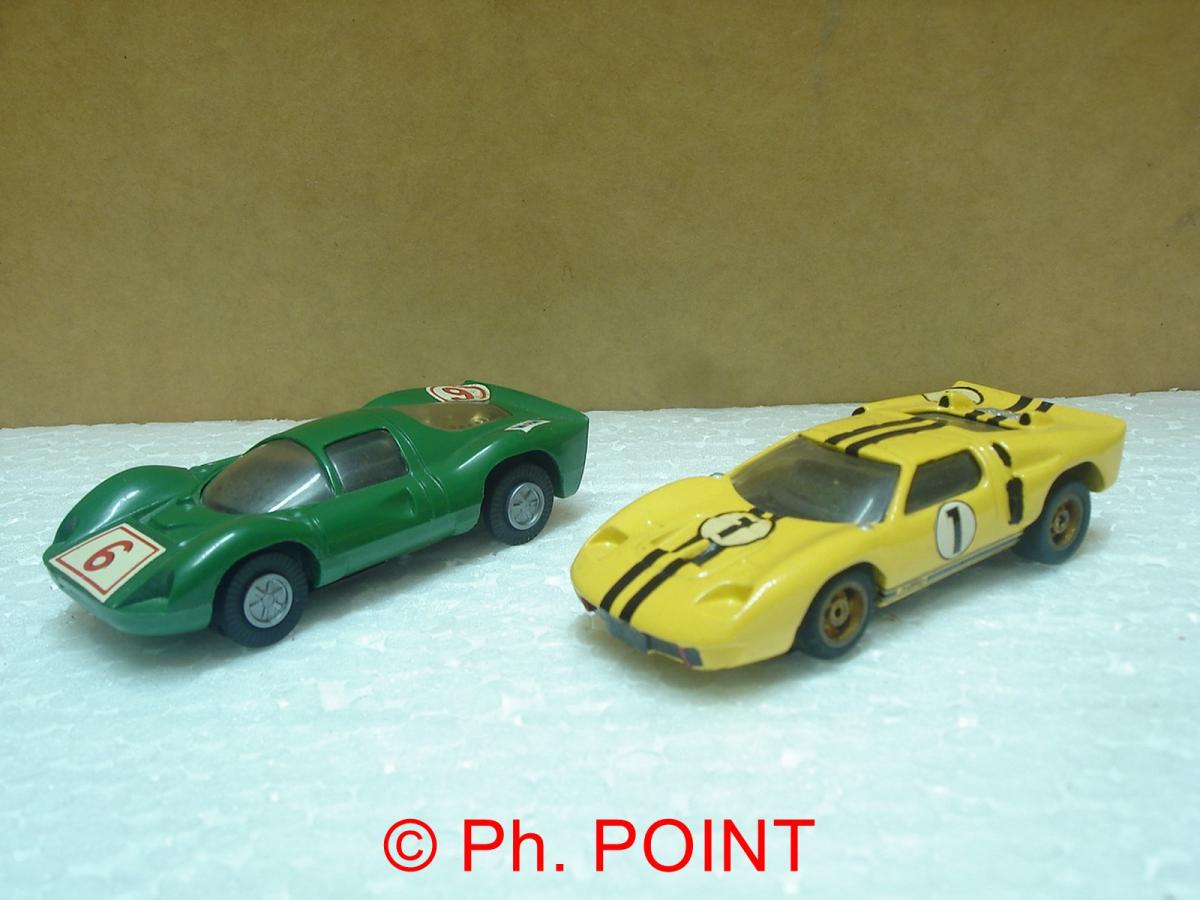 Si pour les autos de tourisme trop grosses ça peut être choquant en comparaison des trains, c'est moins grave avec les prototypes dont on a un peu de mal à se représenter la taille réelle. Jusqu'à un certain point évidement... Ici 2 carrosseries de marque Champion (pas du slot) Ford MK2 et Ferrai P3 que l'on trouve dans toutes les brocantes pour une misère. Montées sur des châssis Aurora Tjet :