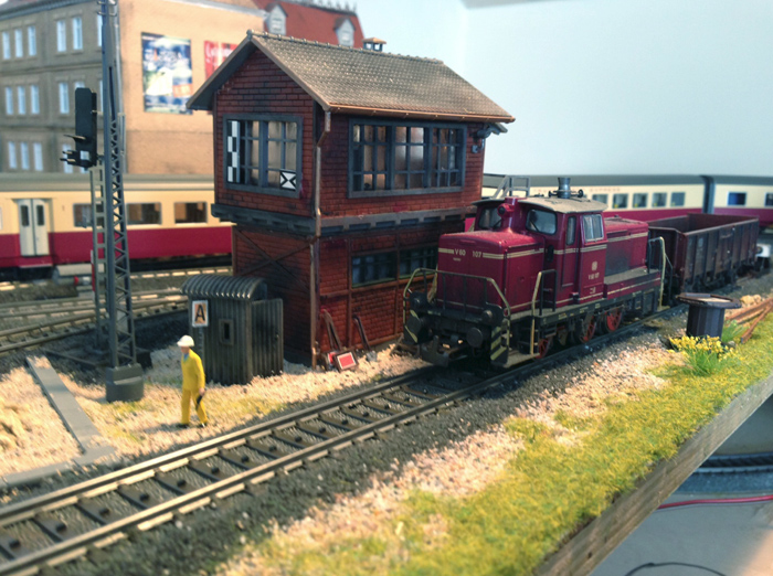 L'avantage quand l'ont à fait du train depuis des années, c'est que l'ont à plein de produits à disposition, donc peinture de la piste avec de la peinture bitume FALLER, puis finition et détaillages à l'Aérographe et avec une voiture qui ne sert plus à rien trempée dans l'acrylique noire pour simuler les traces sur la route.