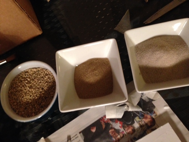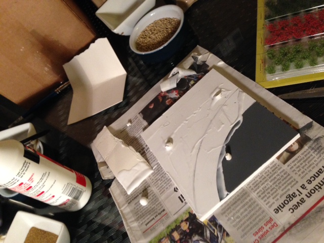 2 - Faire des essais sur une feuille de papier et faire votre mélange de terre, petit cailloux, touffes d'herbe (tout ceci se trouve dans les boutiques de décors ferroviaires en HO sous les marques HEKI et NOCH). saupoudrer à la main sur le support, si vous n'êtes sûr du résultat, google et des images de nature du lieu que vous voudrez représenter seront vos amis. Gardez les petites touffes d'herbe pour "après" le coup de colle final au pulvérisateur.