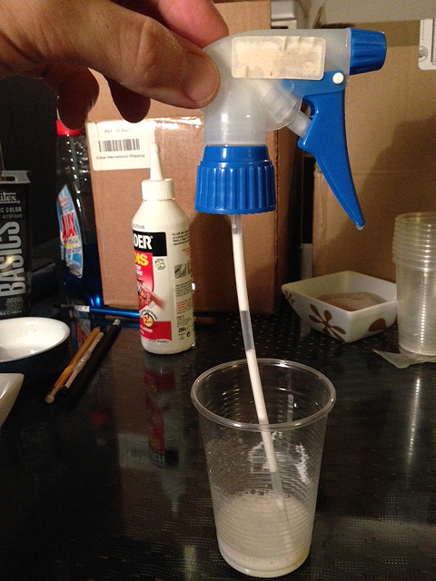 - un collage de ce flocage avec un mélange de colle à bois et d'eau dans un pulvérisateur qui ne se bouchera pas,