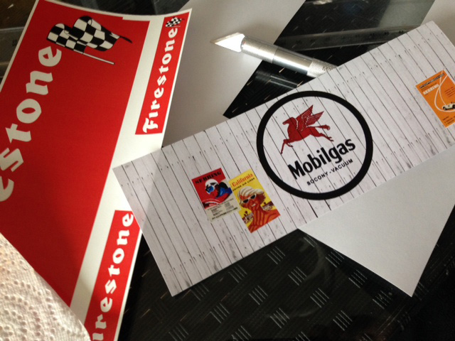 En pleine peinture de la tribune principale, avec quelques coups de photoshop on remplace l'horrible autocollant pas très sexy du kit d'origine par quelque chose de plus dans le ton…