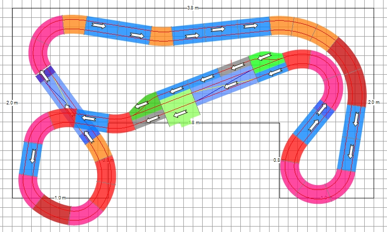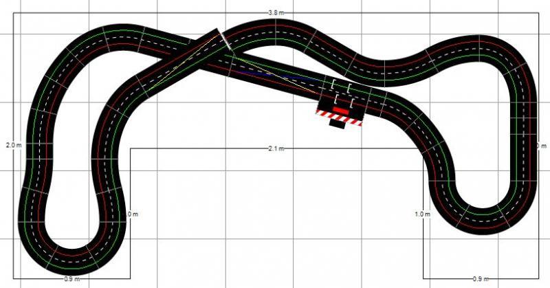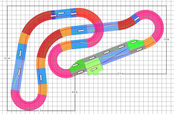 J'ai fait quelques essais pour ne mettre qu'un seul pont, pour garder une bonne pitlane, et pour que la boucle de droite soit moins grande et rentre mieux dans tes dimensions.