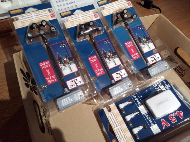 mes achats du jour, 3 lampadaires + alim, trouvés chez jardiland :