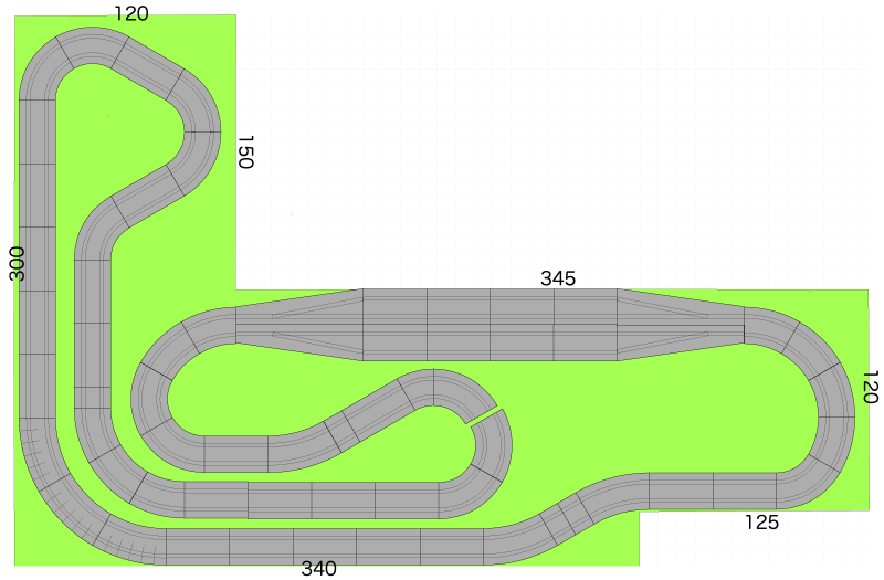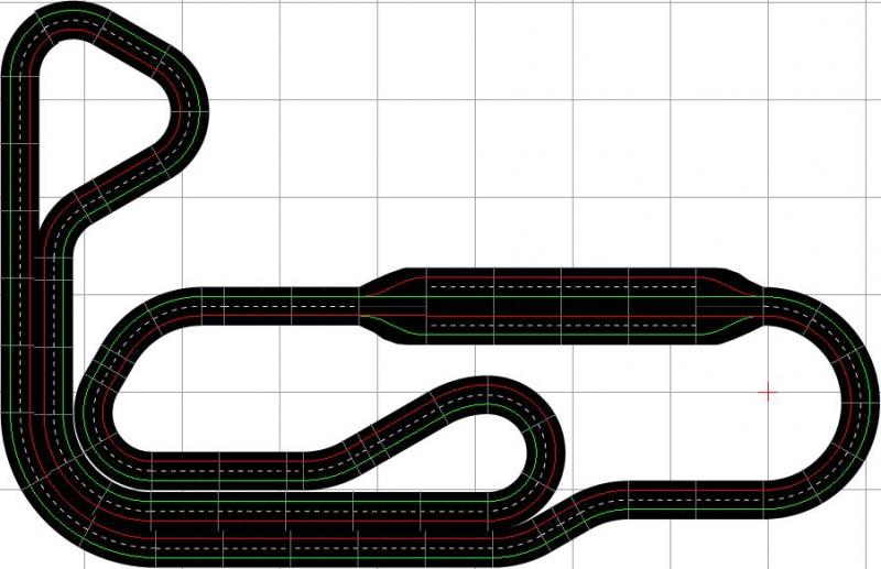 Donc le plateau (en vert) est définitif, pour le circuit c'est une première idée tout en sachant que j'aime bien le côté 4 voies dans la ligne droite (vraiment utile??) et que je souhaiterai aussi ajouter un pont.