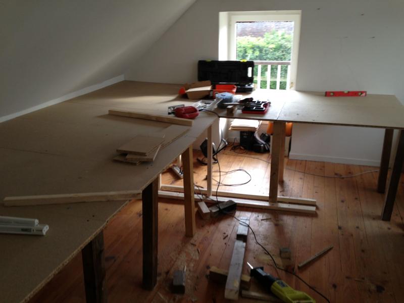 Le format de ma pièce étant spécifique, avec notamment une pente de toit, il a fallu que je trouve le bon compromis pour le plateau pour bricoler mais aussi ramasser (qu'est ce que ça sort qd on débute...).