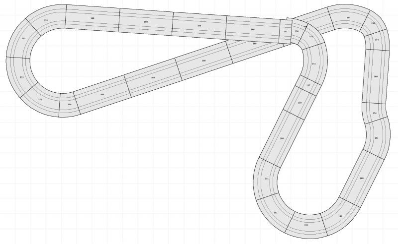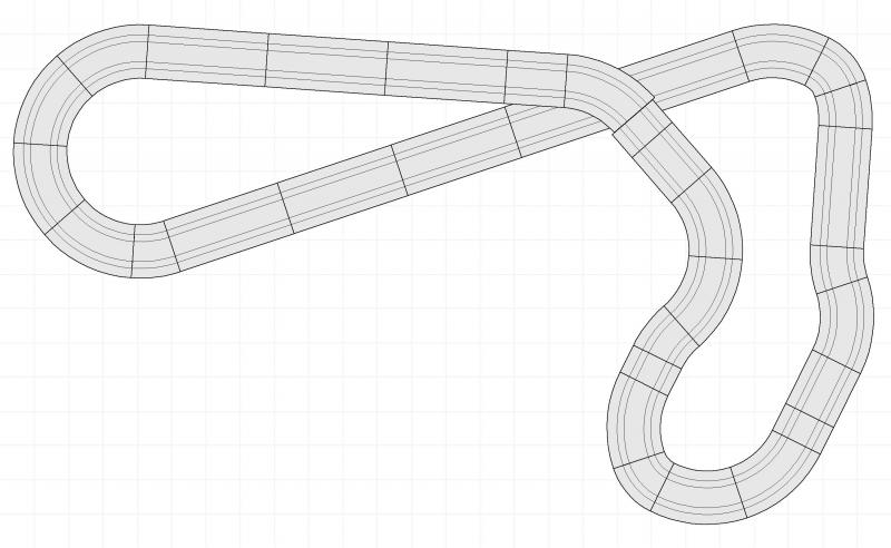 Le tracé actuel de mon circuit ressemble un peu à ça. D'abord j'avais mis la boucle en virage au-dessus de la droite, mais finalement j'ai fait un grand pont pour la droite et les voitures tournent en presque 1s de moins (la boucle étant à plat, elle est plus stable ??). Bref, j'aime mieux.