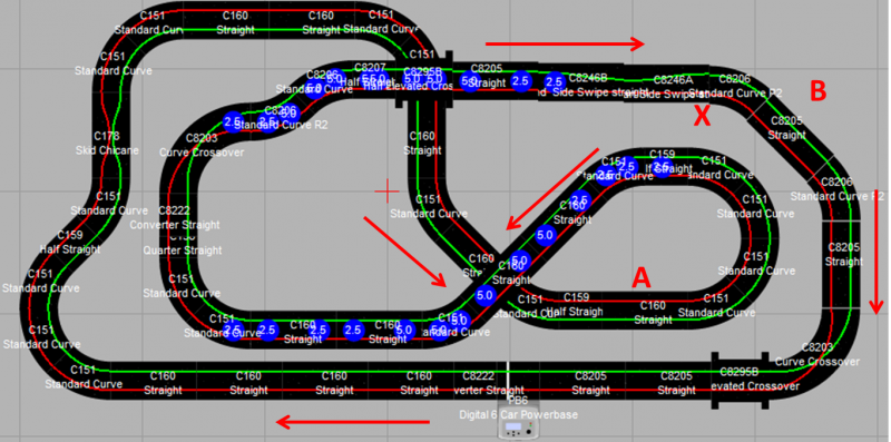 J'ai actuellement une piste scalextric sport digitale qui tient sur une "table" de 2.8m x 2m en 2 plateaux de 2.8m x 1m.