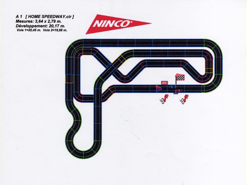Comme je suis nouveau sur ce Forum , mon 1er message sera pour y placer le traçé de mon circuit Ninco 2 voies , avec DS Racing 200 et un développé de 20 m , le tout sur un plateau en L .