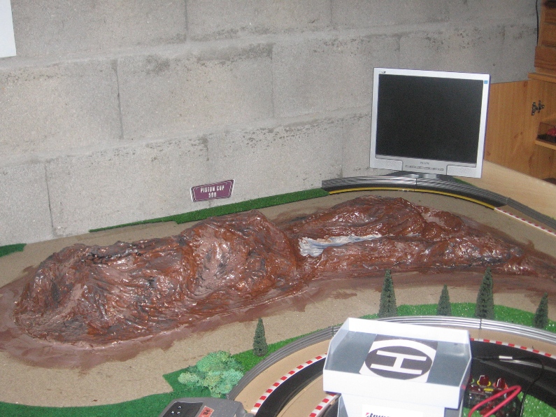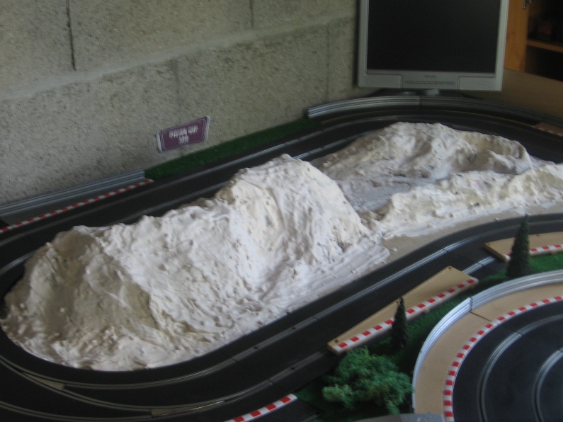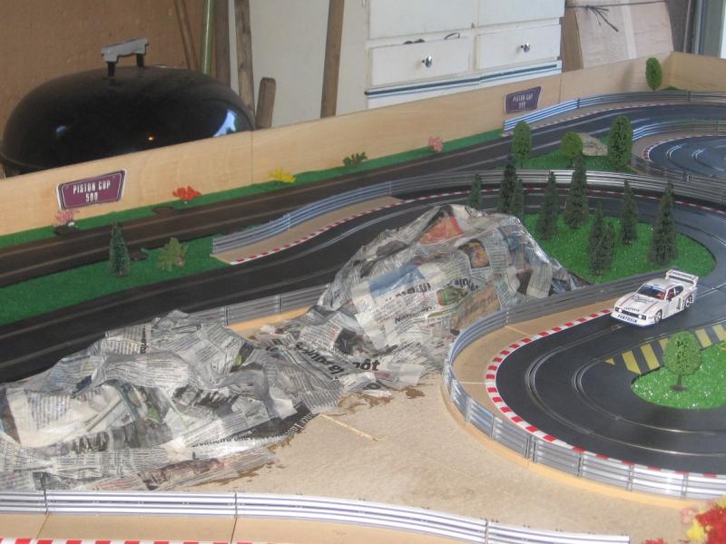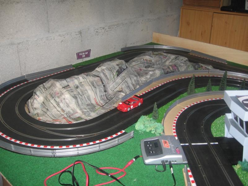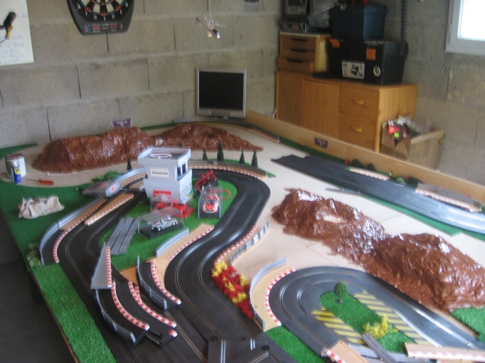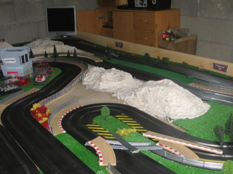 Sympa ta piste, j'ai en projet le MM type de piste au niveau encombrement en Ninco, mais j'ai dans l'idée de surélever la ligne droite du fond, pour gagner un poil de place sans trop de risque