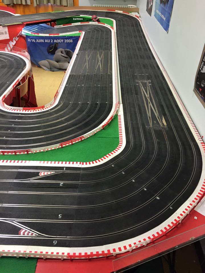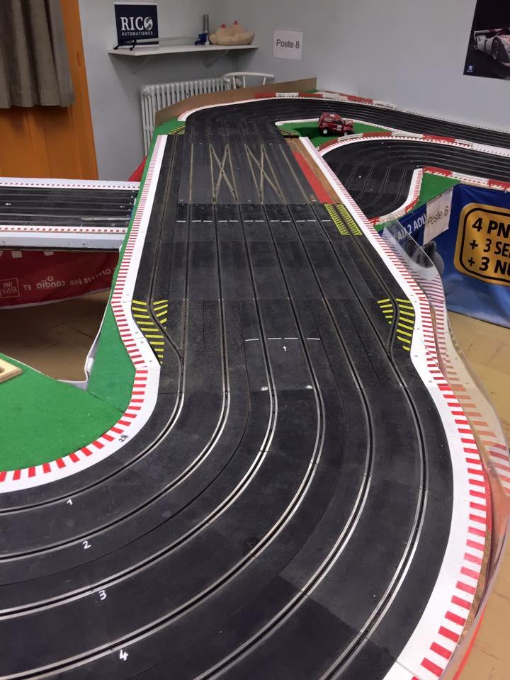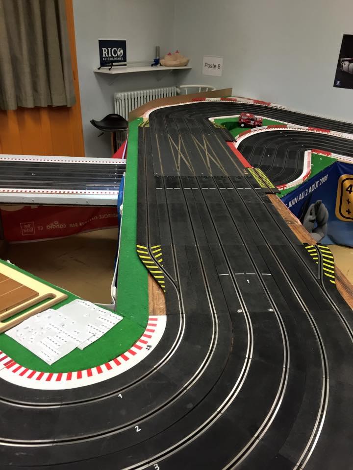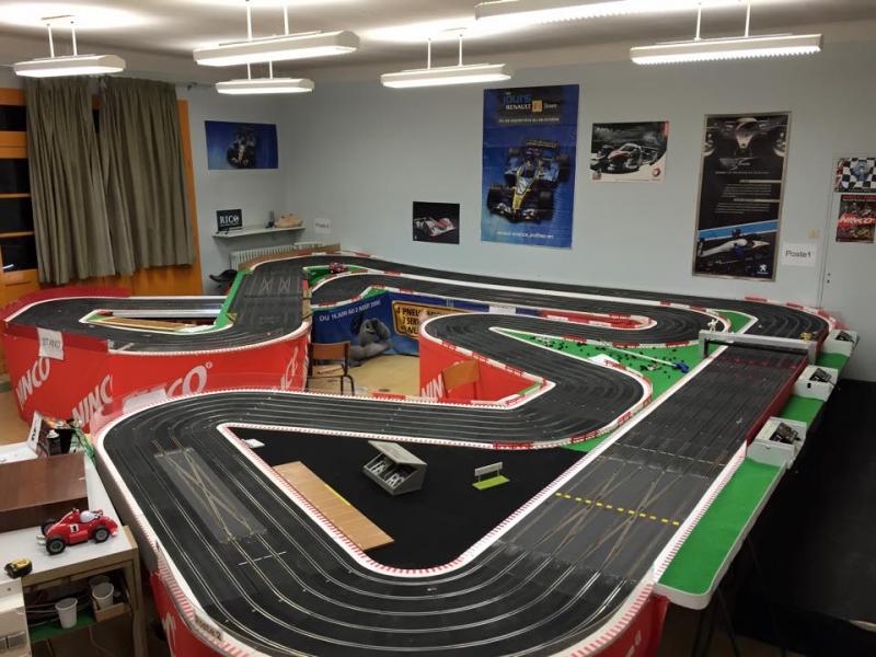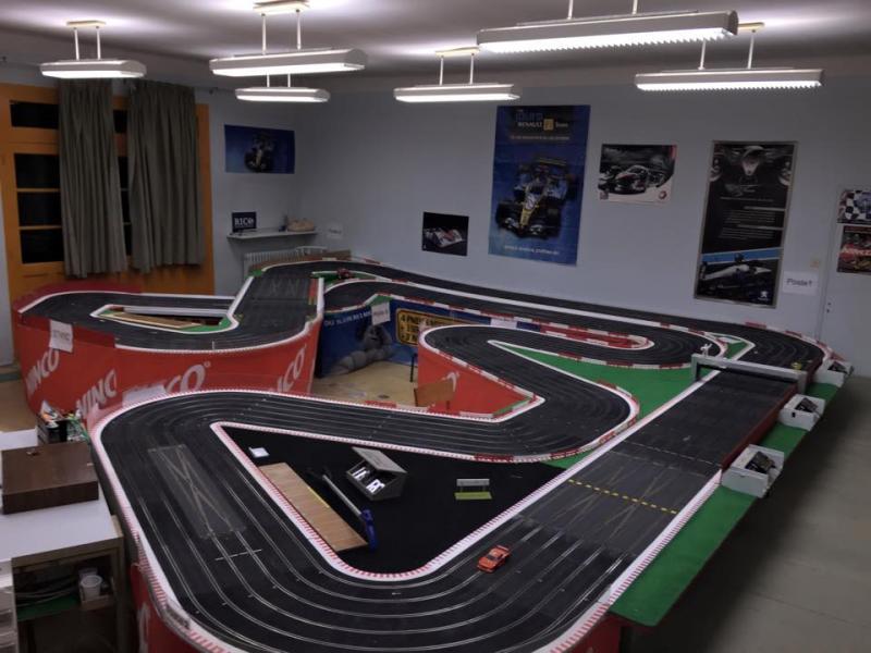 la piste doit faire dans les 30m et la pièce est une ancienne salle de classe je dirais + ou - 65m2 + l'ancien couloir ou l'on pendait nos vestes qui sert de salle de préparation quand il y a des courses.