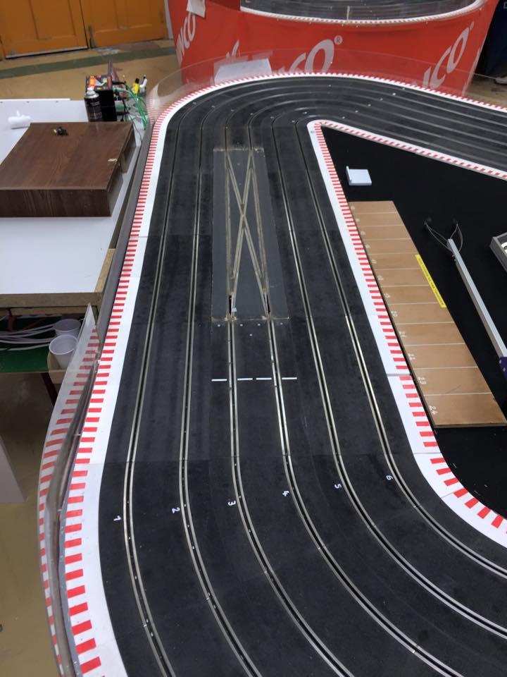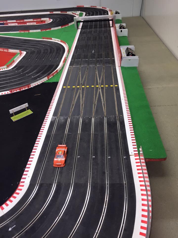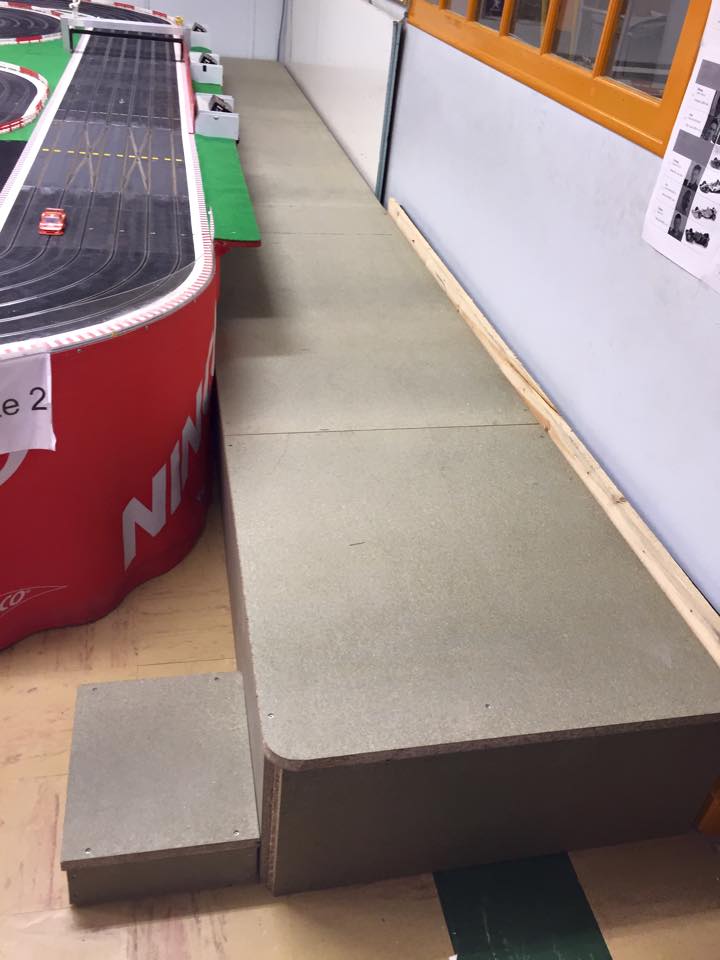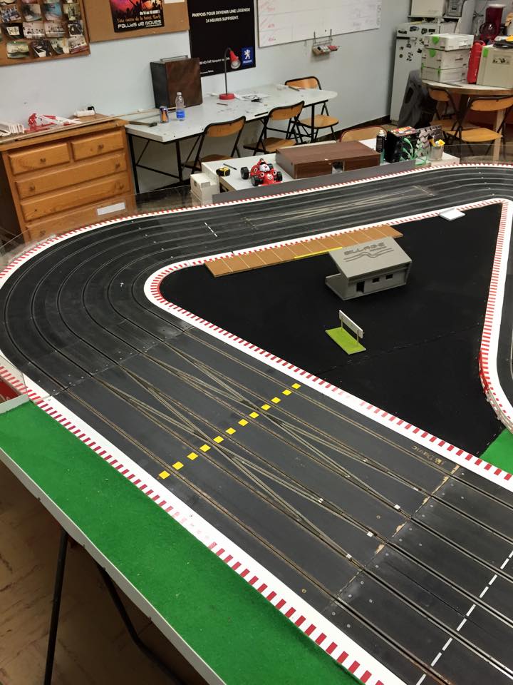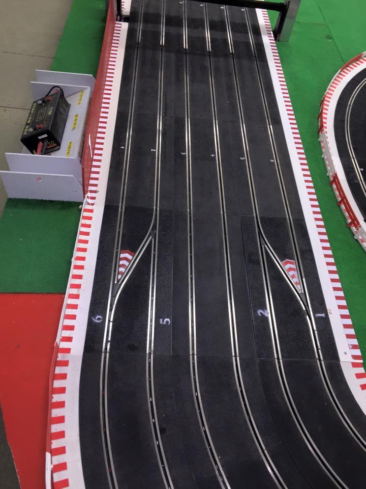 la piste doit faire dans les 30m et la pièce est une ancienne salle de classe je dirais + ou - 65m2 + l'ancien couloir ou l'on pendait nos vestes qui sert de salle de préparation quand il y a des courses.