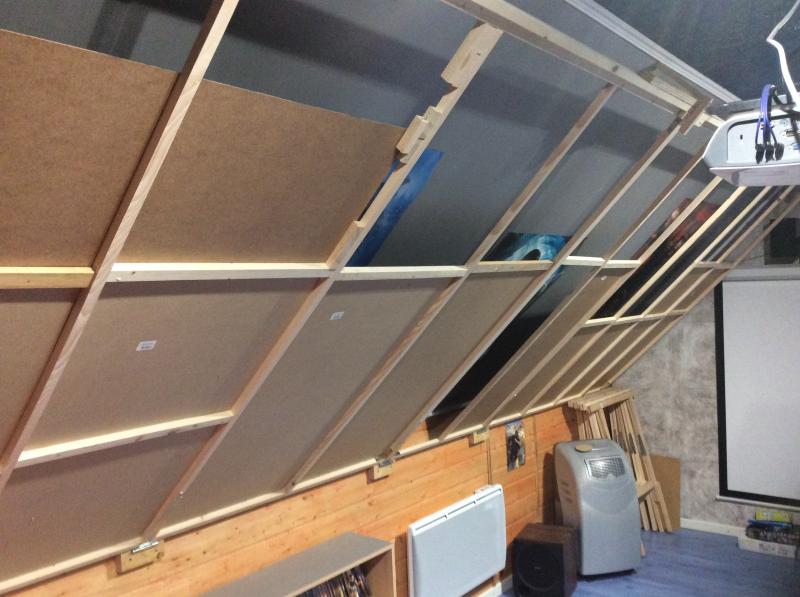 Alors j'ai monté mon circuit dans ma salle ciné car c'est l'endroit ou j'ai le plus de place vue que carrera c'est large. Alors j'ai réalisé un plateau de 4.8 m sur 2 m le long de mon mur rampant pour pourvoir le relevé quand j'utilise ma salle. il y a eu le problème de longueur et de poids alors j'ai installé un treuil électrique 12 v avec un cable acier en trois point du circuit et 5 penture repartie sur la longueur maintenant il remonte le long du rampant j'ai juste à enlever les voitures et voila. dites moi ce que vous pensez de ma piste merci.