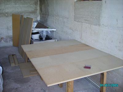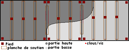 d'utiliser ma même technique avec du tasseau 30 X 30 mm pour chacun des panneaux et ensuite de visser chaque panneau de leur côté le plus court sur un tasseau maître de section plus importante reposant alors sur des pieds.