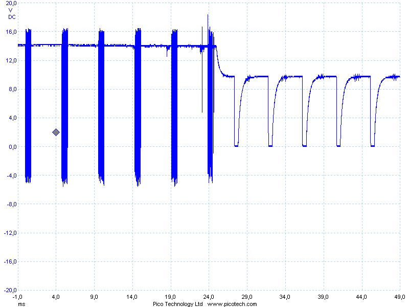 A gauche, c'est le trafic 'copié' du trail principal, au moment ou la tresse de la voiture fait jonction entre le rail principal et la zone de coupure. A droite on voit la voiture faire chuter la tension. La durée de la chute donne la position du bouton de changement de piste, l'intervalle entre deux chutes le numéro de voiture. Le graphe a été fait avec la voiture 8. On voit qu'il y a un condo qui se recharge entre deux chutes. Le condo est très probablement dans la console car de mémoire il n'y a pas d'électronique au niveau de la coupure, juste des fils qui reviennent dans la base. Si ce condo met plus de temps à se charger à cause de l'ajout de longueur de fil, et si les voitures se suivent d'assez pret au moment du passage sur la zone, va savoir si tu as le même signal chez toi. Pas moyen de te faire préter un oscillo et de vérifier ce que ca donne chez toi?