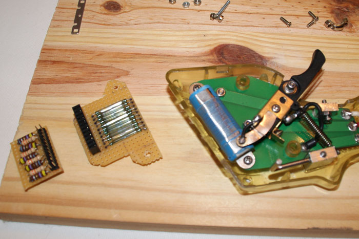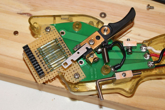 2- ensuite, l'aimant a un spectre assez large. si on décale un peu en position repos comme sur les photos vers la droite la lamelle qui porte l'aimant, alors on mets en contact la première ampoule.