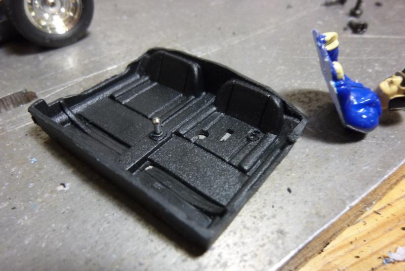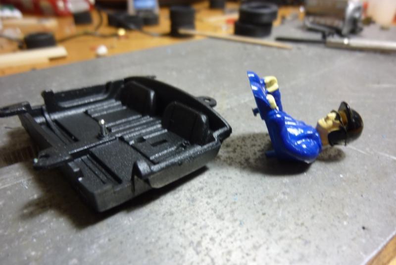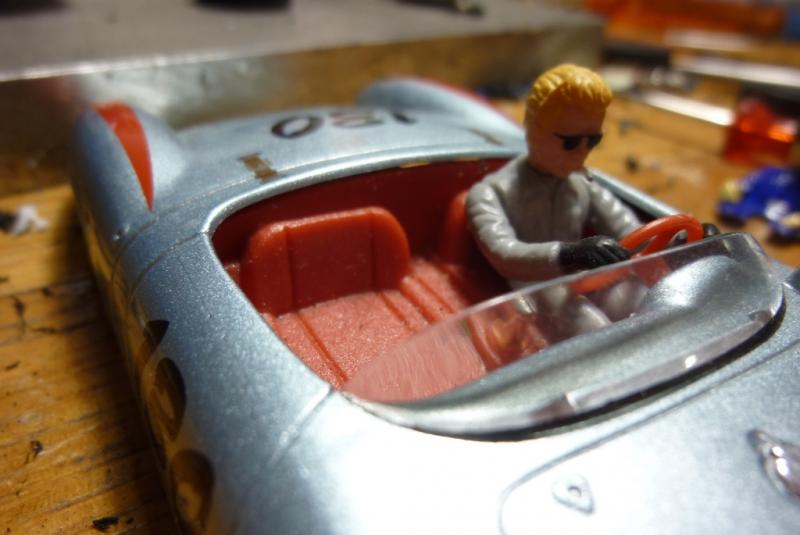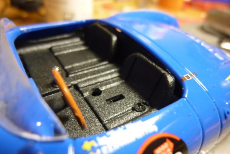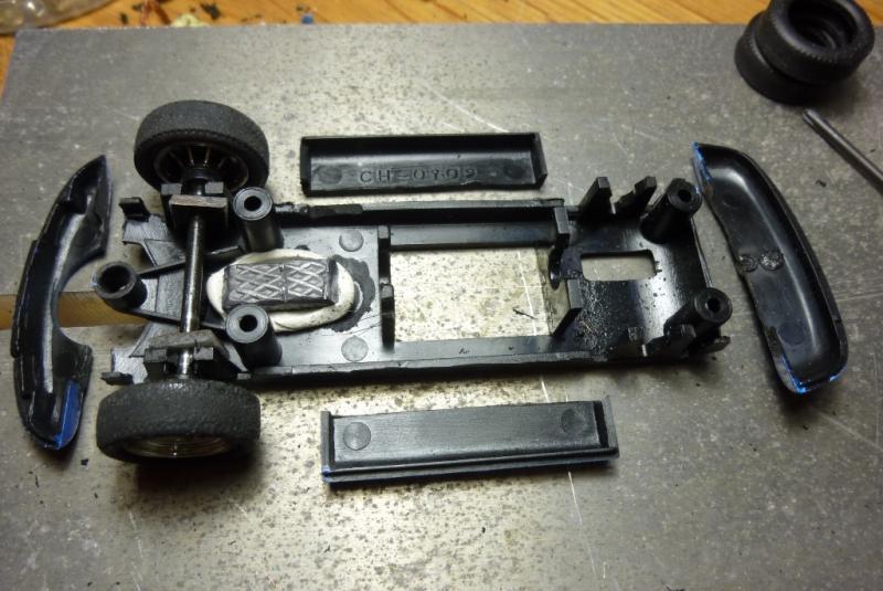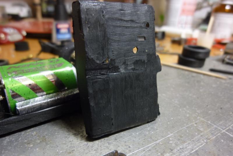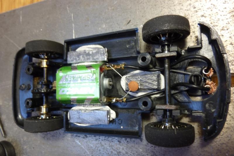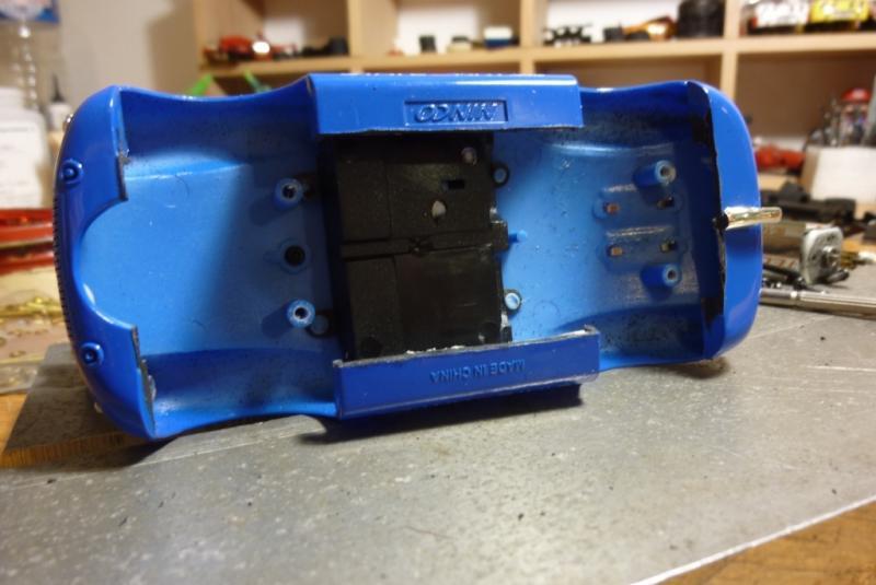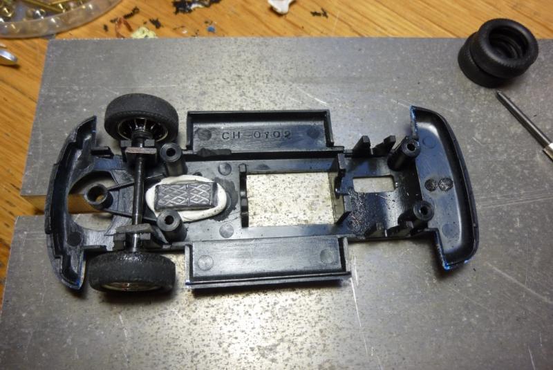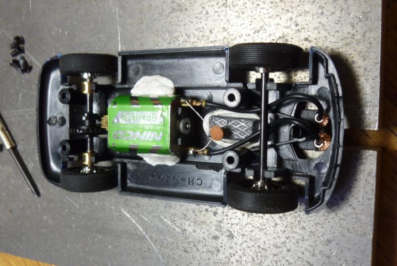 3- comme la voiture semble un peu trop légère, usinage à la Dremel du logement de l'aimant d'origine et du bossage qui sert à la fixation de la voiture dans sa boite afin d'y placer un lest de 5grs (juste entre les 2 plots de fixation avant) et blocage du moteur à la Patafix. Poids de la voiture: 67grs.
