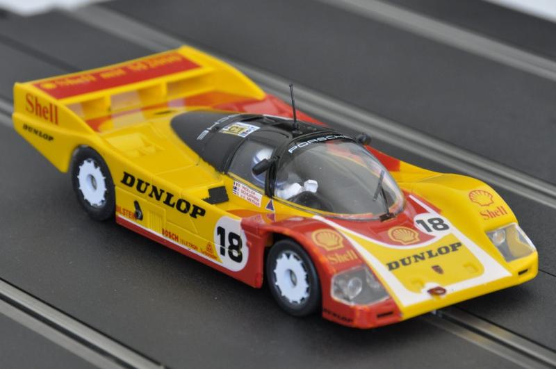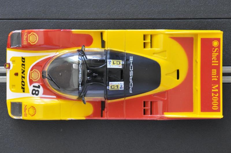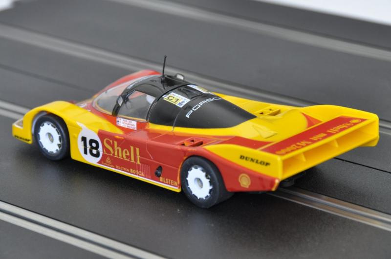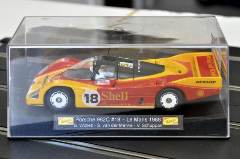 après une Slot.it Toyota Minolta LM88 avec décalques Capitaine Paddock, alias La Praye, alias Laurent (Toyota Minolta Le Mans 1988, 5ème et 6ème posts) et une Scalex Mercedes CLK LM98 avec décalques Pattos (Mercedes CLK Le Mans 1998), voici une Scalex Porsche 962 Shell, avec complément de décoration Pattos et châssis HRS Slot.it.
