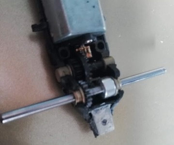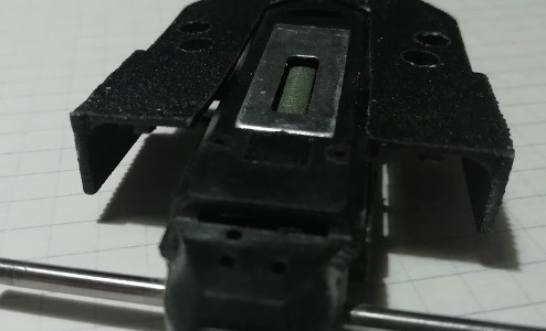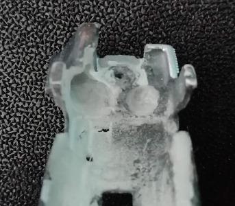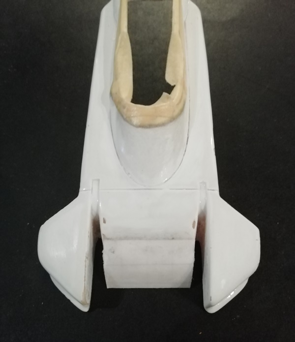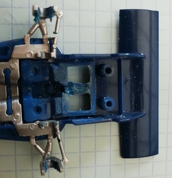 Le fait d'avoir voulu positionner le guide bien en avant de ce que Scalextric a prévu a provoqué un problème que je n'avais pas imaginé au départ !!! Les fils issus du guide et qui alimentent le moteur frottent lamentablement sur la profondeur des radiateurs de la carrosserie d'origine. Il faut enlever de cette profondeur et pas qu'un peu!