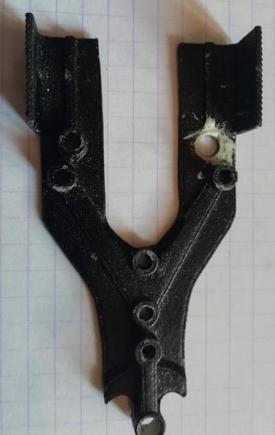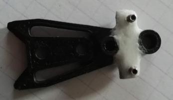 Après avoir élargi et surtout allongé en hauteur le passage de roues des suspensions (en collant un carton + super glue + poudre), l'axe avant peut enfin passer avec un débattement vertical suffisant. Il faudra aussi prévoir une rondelle à l'intérieur de la jante avant pour que celle ci ne frotte pas sur les suspensions.