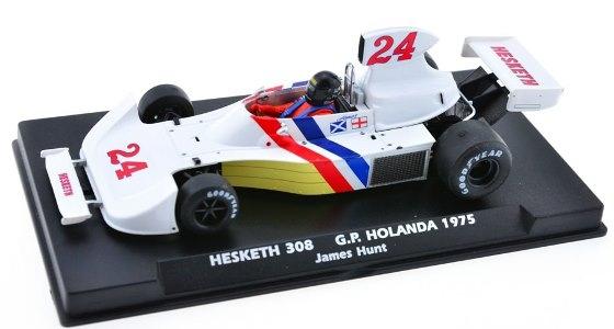 * Modèle de l'échelle 1 reproduit: HESKETH 308 n°24 (nouvelle version) pilotée par James Hunt au GP des USA, dernier GP de la saison 1974. Il partira en 1ère ligne et termine 3ème de la course.