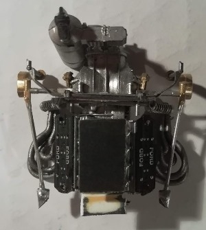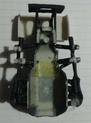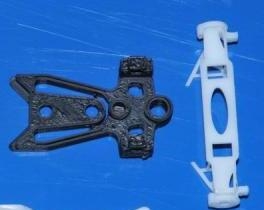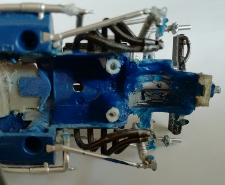 L'ensemble peut se désolidariser de la carrosserie. Je renforce à la super glue les points qui me paraissent fragiles. Je recolle l'ensemble bloc moteur-suspensions avec de la néoprène sur la carrosserie.