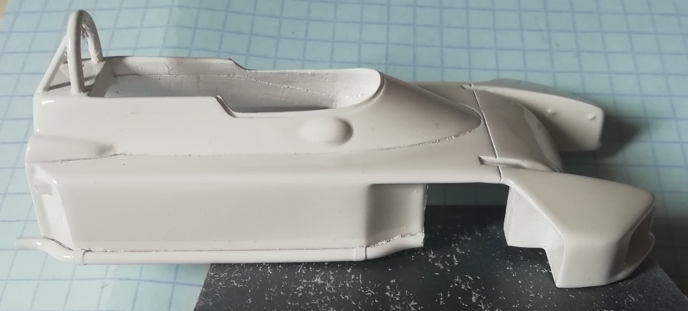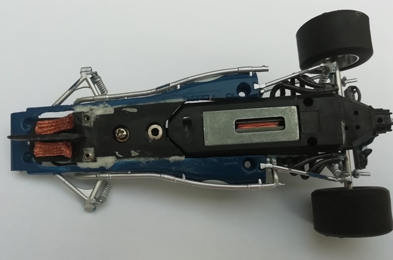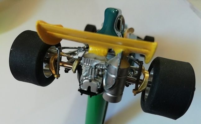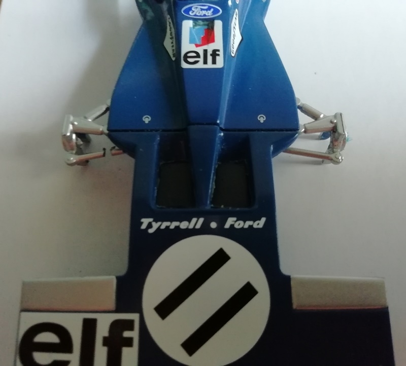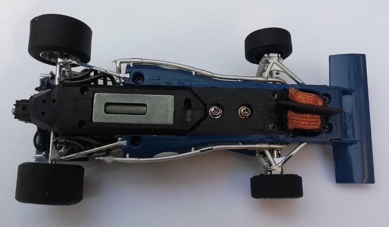 Une fois remontée la Tyrrell 003 est prête à affronter la piste. Quasiment toute la carrosserie d'origine de Scalextric et notamment la partie moteur a pu être conservée.
