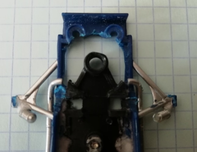 Impossible cependant de conserver les passages de roues avant du châssis March Policar. Ils sont trop hauts et empêchent de refermer le nez de l'auto. Je les coupe et comble les trous du châssis en créant de l'épaisseur afin d'y percer 2 petits trous ,juste en dessous de l'axe avant, où pourront se loger 2 vis hexagonales qui permettront de régler la hauteur d'axe avant.