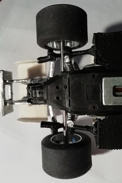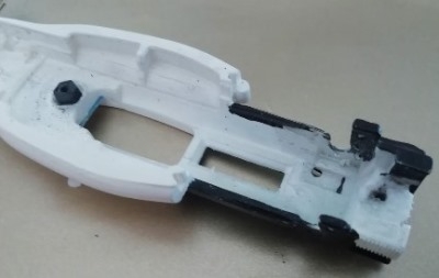 J'ai choisi d'utiliser un châssis March Policar dont j'ai découpé tout ce qui se trouve en avant du puits de guide. Cela permet d'agrandir la distance axe arr - puits de guide, trop courte sur la Scalextric. j'ai collé cette partie de châssis March aux bords découpés du châssis Scalextric. D'abord avec de la colle néoprène afin de pouvoir l'ajuster correctement. Puis, une fois sec, je consolide avec de la super glue et de la poudre style bicarbonate. Enfin je ponce et je peint.