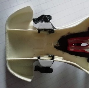 Ensuite, il faut pouvoir le régler en hauteur afin que les pneus avant effleurent la piste. Sur aucun kit, ni sur les Scalextric ce réglage est prévu. C'est par contre présent sur les châssis Policar. Il faut donc, ici, les fabriquer. J'ai placé un carton épais rigidifié en transversal juste en arrière du puits de guide en creusant un peu la pièce que Bulconcept à prévu en avant du support moteur Policar.