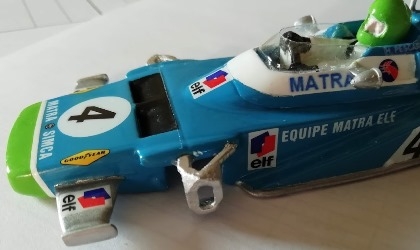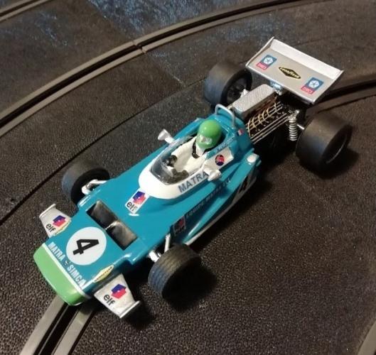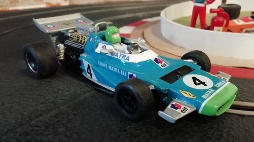 La voiture est très saine et c'est un plaisir de la voir tourner aussi bien. Il faut limer le guide trop profond pour mon circuit. Aucun réglage n'aura été nécessaire. Seule une roue avant s'est détachée de son axe. Un point de colle et on en reparle plus ; Les tours sont réguliers entre 13‘'150 et 13''3. Nul doute que lors du test plus détaillé, la Matra passera sous les 13''.