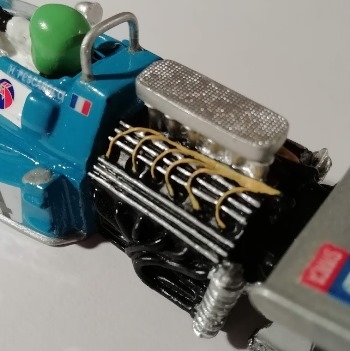 Je passe ensuite à la décoration moteur resté masqué pendant le vernissage. En argent les liserés du V12, les trompettes, les ressorts de suspension. En jaune les fils d'allumage, en gris foncé la boite de vitesse et sorties d'échappement.