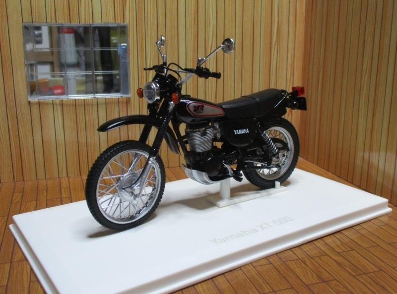 Une Yamaha XT500 Norev, que je pense au 1/18e. Je la trouve moins jolie que la mienne (modèle 1U6 1977) mais comme actuellement je n'ai encore jamais trouvée ce modèle bien précis qui était la première version de l'XT avec le coude du pot d'échappement passant sur le haut du carter moteur, je me contenterai donc de celle-ci que voici